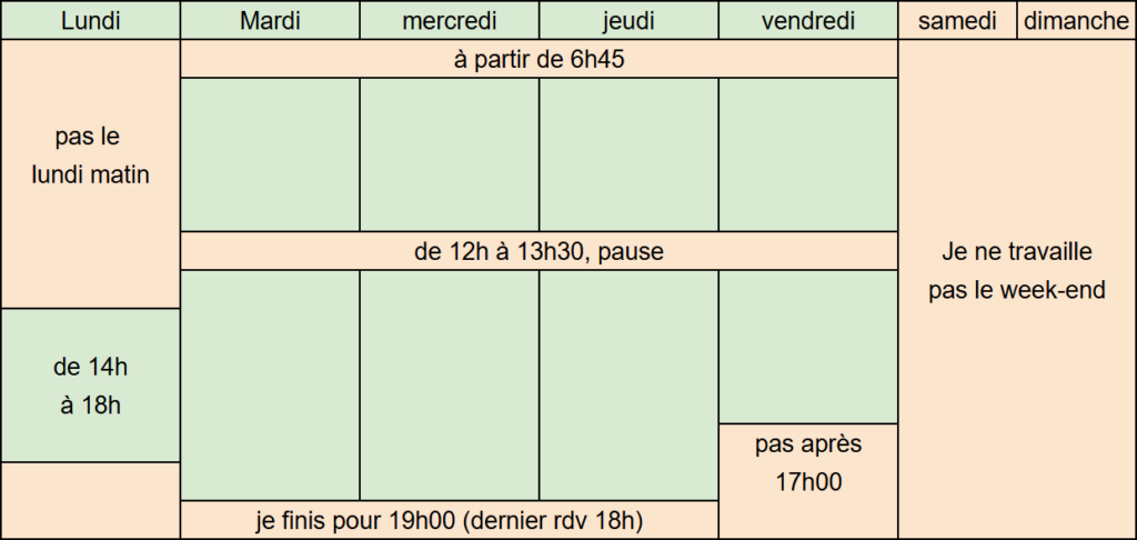 Je ne reçois pas les lundis matin, vendredis après 17h ni samedis et dimanches.